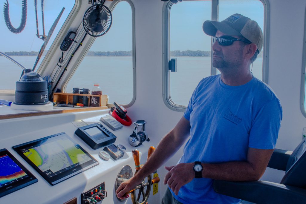 The captain of the R/V Reid W. Harris, Robert Overman holding a steady course down the plotted line on the Garmin. This steadiness and consistency is the heart of this whole survey.